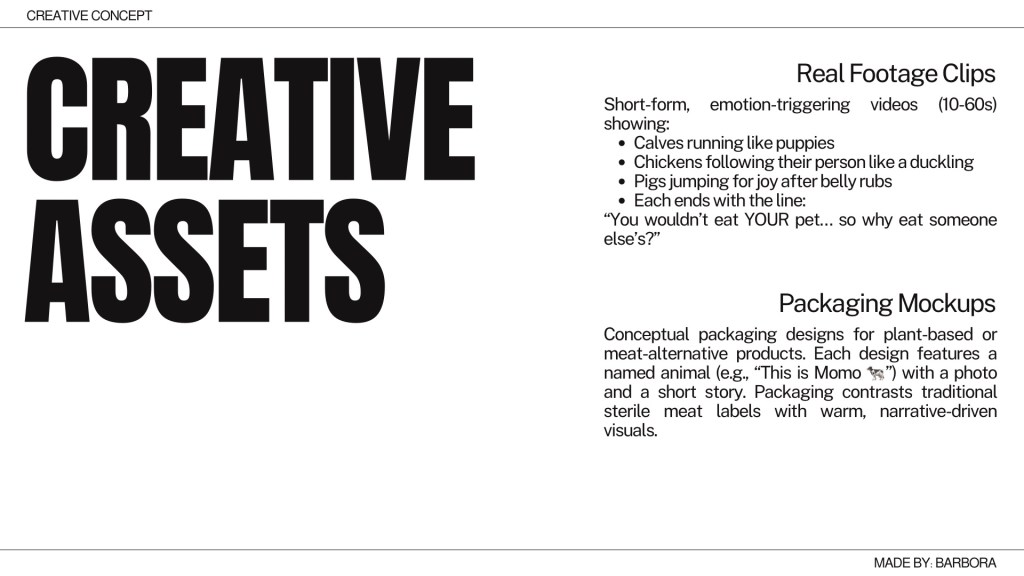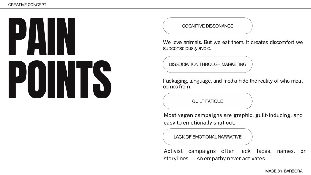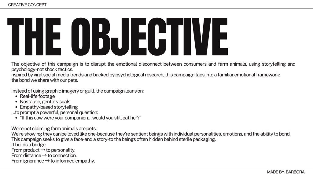 So I started designing a campaign – scalable, emotionally grounded, and built to activate empathy – one cow, one pig, or one chicken at a time.
